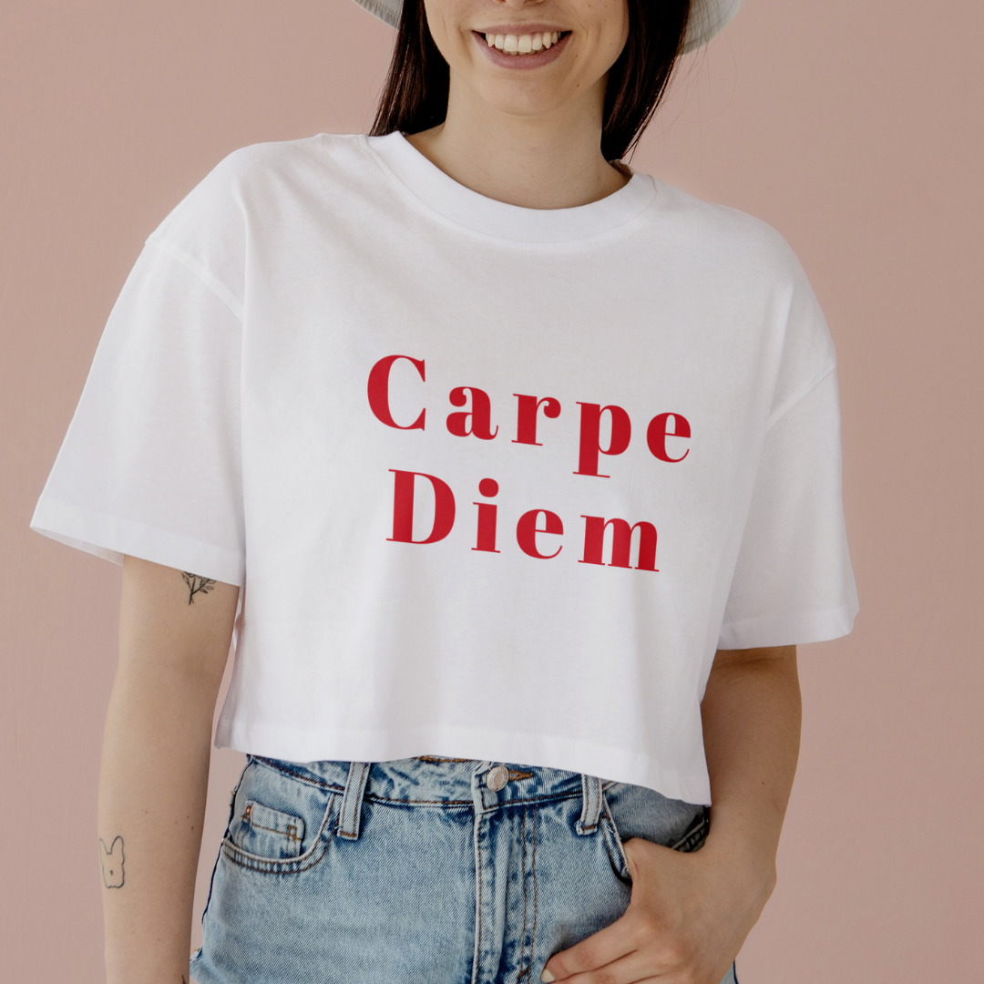 Uma estampa minimalista e impactante, onde a frase "Carpe Diem" se destaca em uma tipografia elegante e moderna. Sem distrações, o design foca inteiramente na mensagem poderosa de aproveitar o dia, inspirando a viver o presente ao máximo. Ideal para aqueles que buscam motivação diária através da simplicidade e estilo.