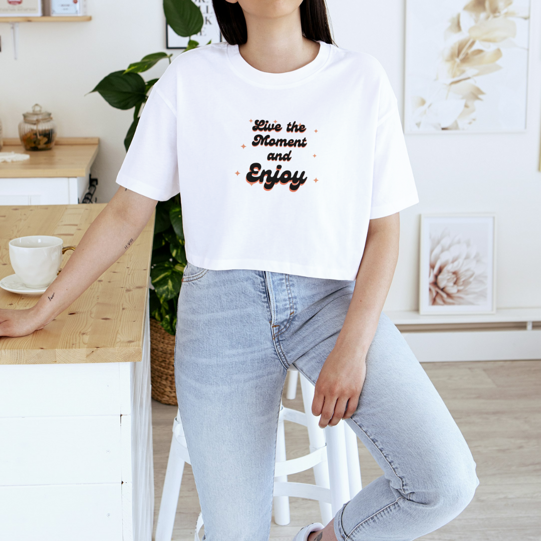 Eleve seu estilo com o Cropped Live the Moment and Enjoy! Perfeito para quem aprecia simplicidade e impacto, este cropped traz uma estampa única focada exclusivamente na escrita. Feito com material de alta qualidade, ela oferece conforto e durabilidade, ideal para o uso diário. A frase "Live the Moment and Enjoy" é impressa com um design moderno e minimalista, que se destaca em qualquer ocasião. Seja para inspirar sua criatividade ou para adicionar um toque de personalidade ao seu guarda-roupa, o Cropped Live the Moment and Enjoy é a escolha perfeita. Disponível em várias cores e tamanhos, ele se adapta ao seu estilo e é um excelente presente para amigos e familiares. Imagine, inspire e vista-se com estilo!