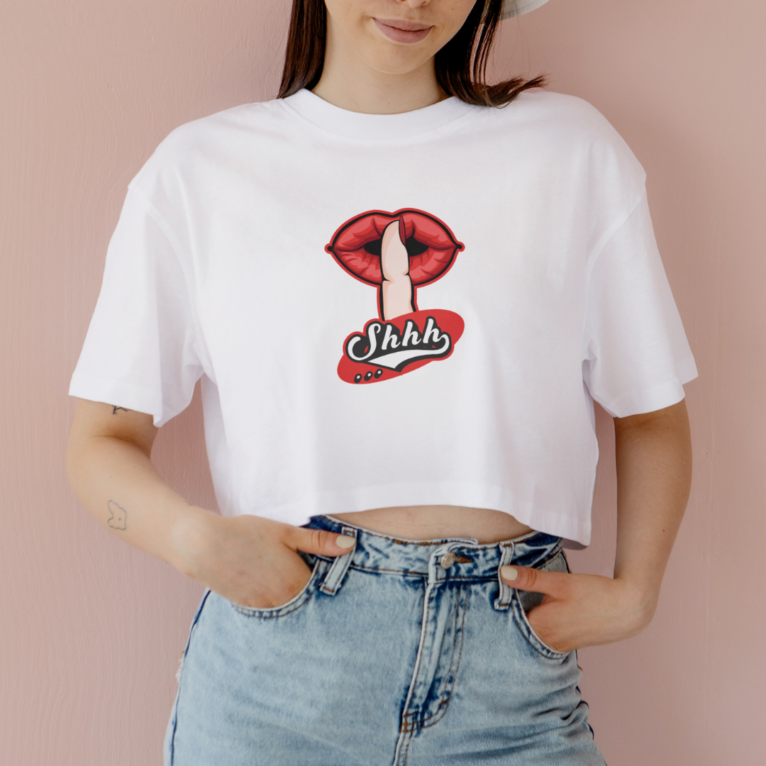 Transmita uma mensagem sutil, porém poderosa, com o nosso cropped "Shhh." Uma forma direta de dizer "fique quieto" sem precisar falar. Com o cropped "Shhh.", você pode comunicar de forma criativa e visual a importância do silêncio.