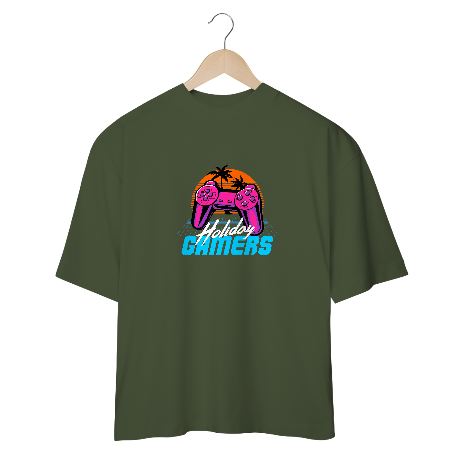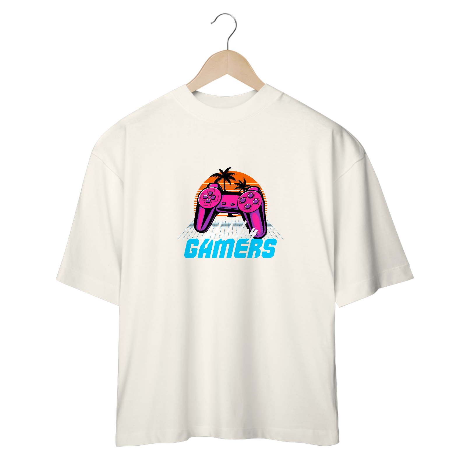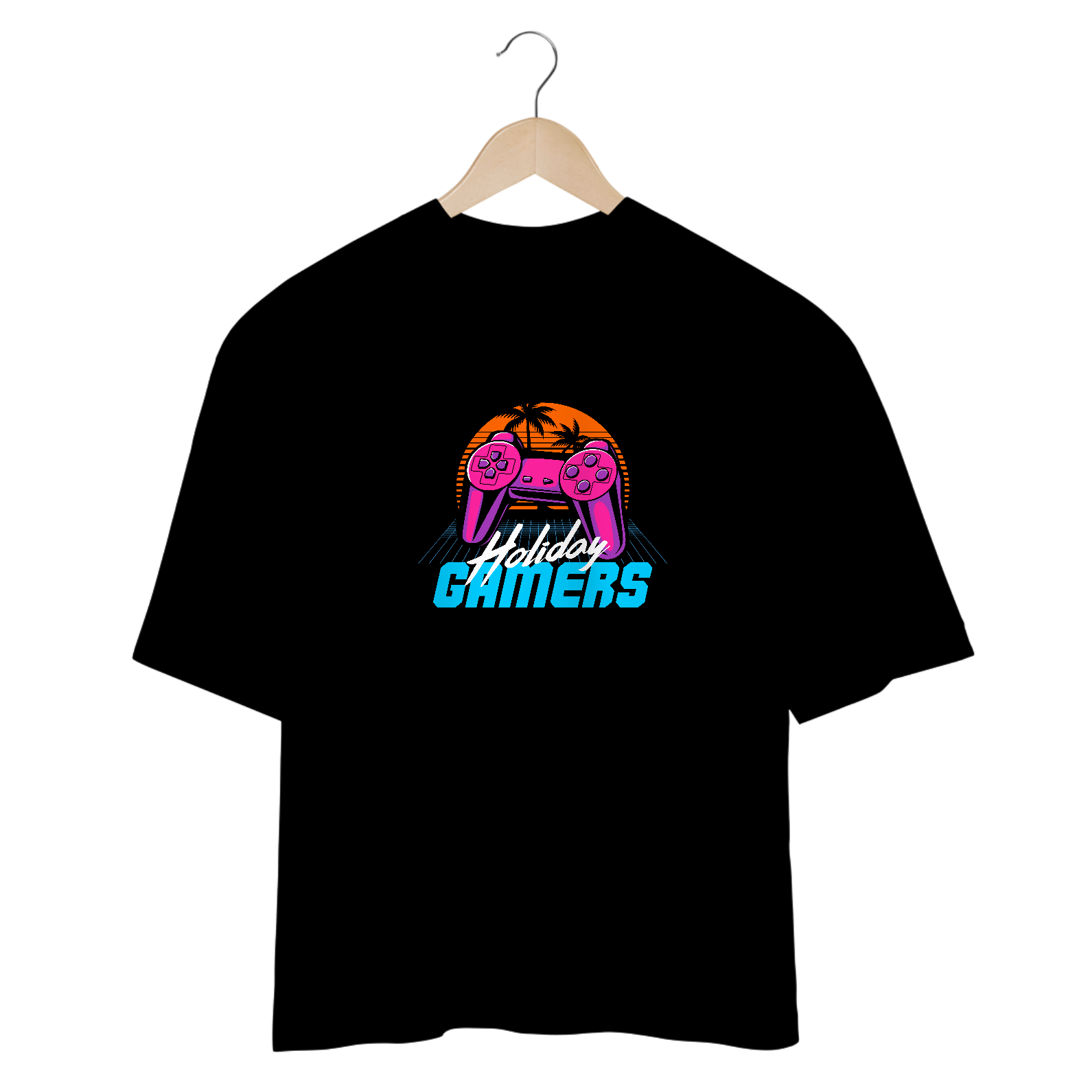 Férias? Jogo novo? Ou só um momento épico de descanso no seu universo virtual? A estampa Holiday Gamers traz a vibe perfeita! Inspirada no estilo retrô neon dos anos 80, essa arte mistura um controle vibrante, um pôr do sol tropical e aquele ar nostálgico dos melhores dias de jogatina.